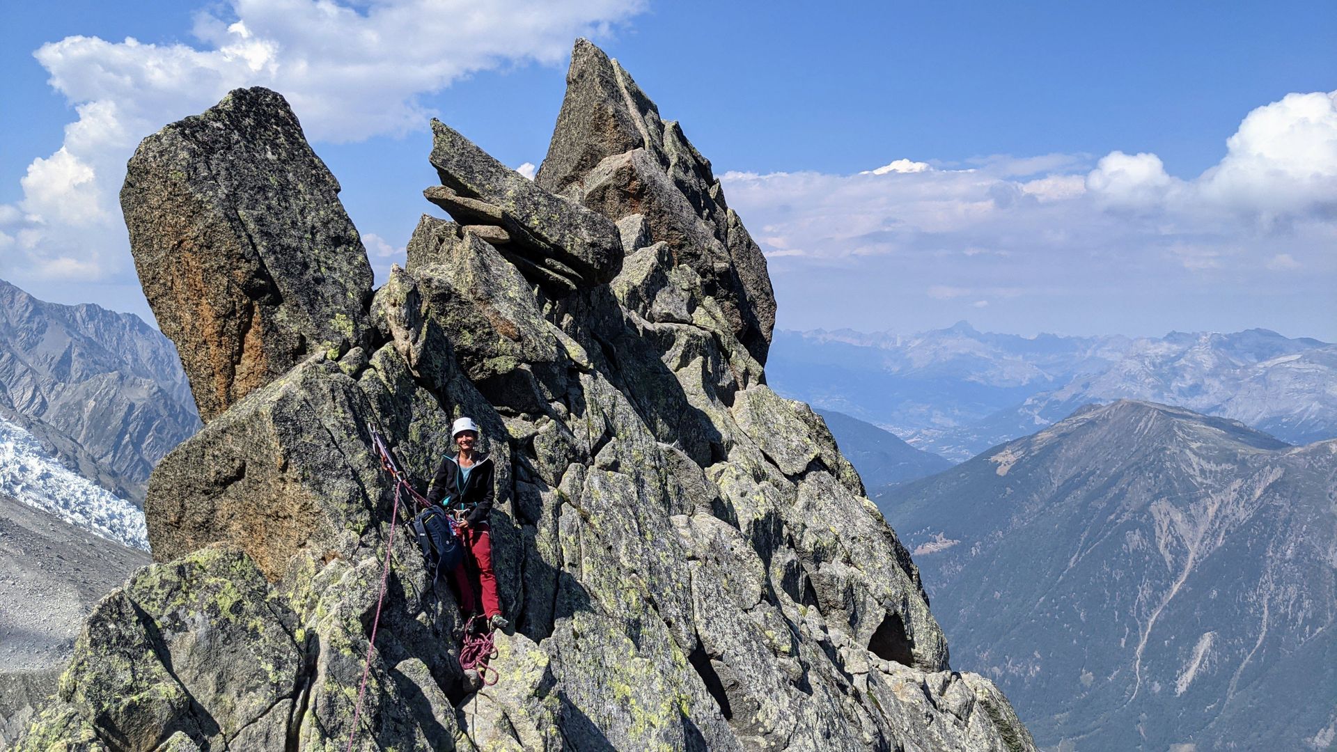 Bien à l'aise sur la sortie de la veille à l'aiguille de l'M, on décide de monter d'un petit cran à l'aiguille du Peigne avec les Lépidoptères ! Départ plus tôt, cotations plus dures, voie plus longue et horaire plus serrée, sur le papier on est larges mais va falloir confirmer les apprentissages. On se lève à 4h pour le petit déj au refuge du plan de l'aiguille (super accueil la veille et super petit dej pour démarrer la journée). On a dormi 5h, mais on est d'attaque ! On monte avec le soleil qui se lève tout doucement, pas si simple de s'orienter dans le noir. Le lac bleu pas encore dans ses couleurs habituelles à cette heure-ci On galère un peu à comprendre l'itinéraire, puis on attaque la traversée sous l'arête des Papillons. On traverse une zone d'éboulis franchement instable et exposée, une bonne occasion de mettre en pratique nos nouvelles techniques de corde tendue (et surtout de "pas de chat" pour se pas faire rouler les gravats), puis on fais un relais sur friends pour la longueur de 15m dans l'approche. On commence à maîtriser ! On se trompe un peu de départ de voie, puis on démarre finalement avec 1h30 de retard sur l'horaire prévue. Aujourd'hui c'est Ivann qui ouvrira tout (quel guerrier). Moment convivial pour tout le monde, sauf Ivann qui fait la L2 (longueur la plus dure de la voie) Les relais sont chaînés mais pas méga confort, mais comme on est tous seuls dans la voie on avance à un rythme ultra rapide. Ambre ouvre deux longueurs pas faciles du tout sur coinceurs sans Hugo pour la rassurer, c'est dur mais elle passe sans soucis 💪 Full protections amovibles, GO AMBER !! La fin sur l'arête est ultra effilée et sympa, on se marre bien. Malgré un triple blocage de rappel qui force Kevin et Hugo à repartir dans la voie normale, on arrive à 15h à l'UCPA avec un gros sentiment d'avoir pris du skill de ouf pendant cette semaine. Merci Hugo et la dream team ! Progression sur arête en grosse détente, check Photo finish avec l'équipe à la cabine du plan