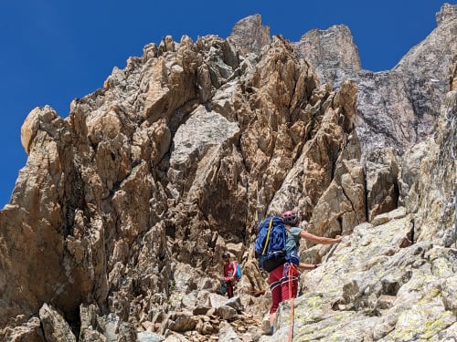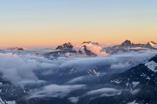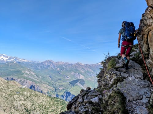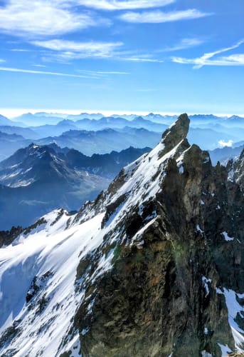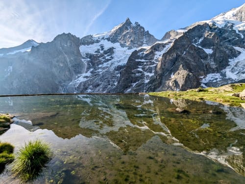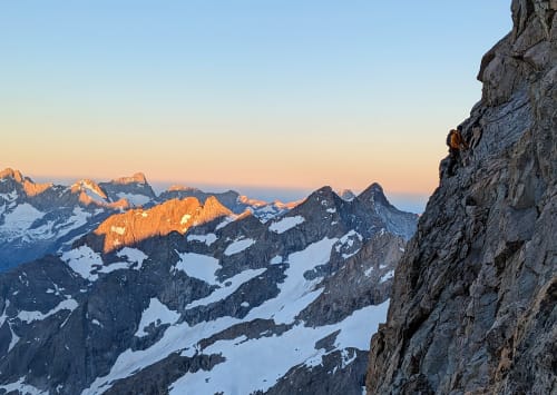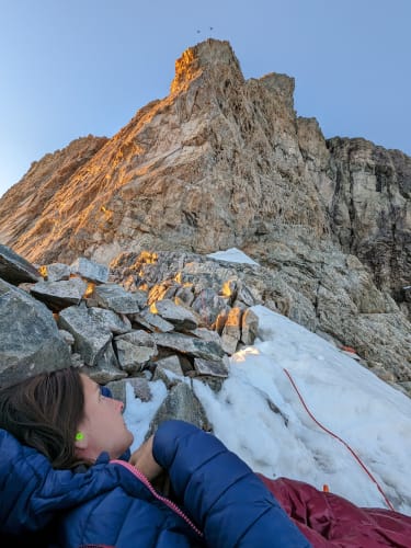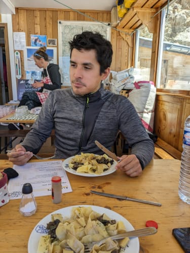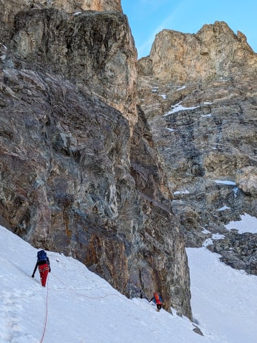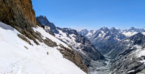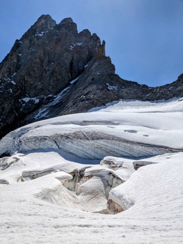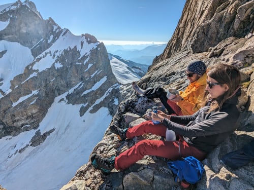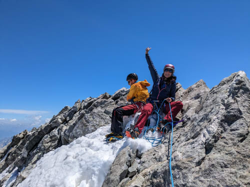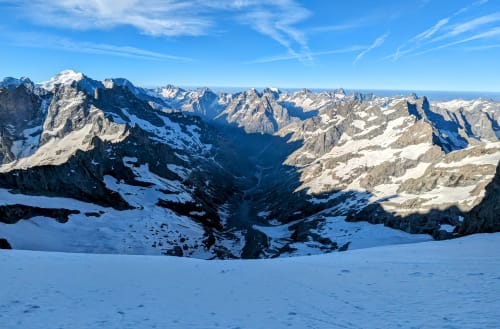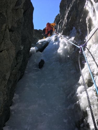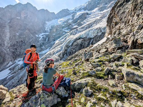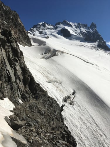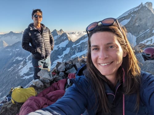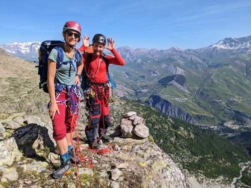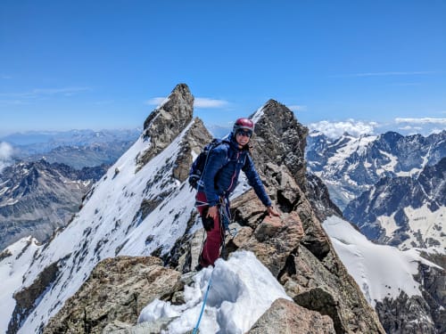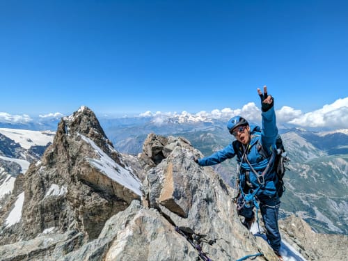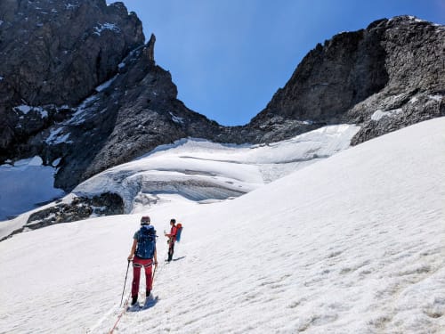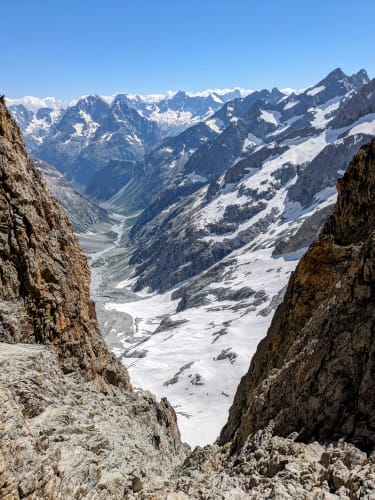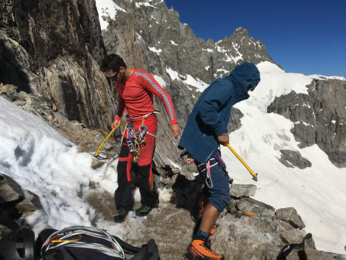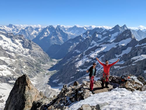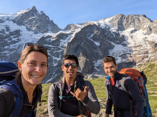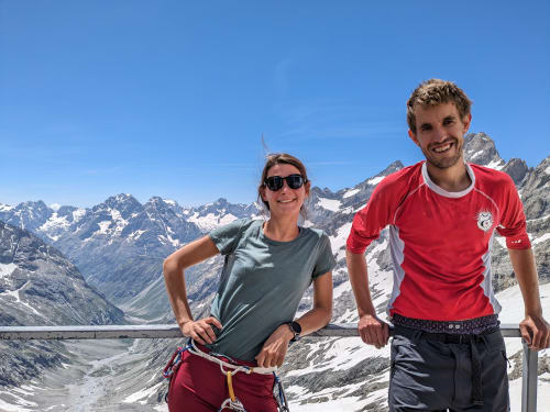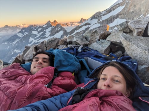 Annulée l'année dernière à cause d'une blessure a l'épaule de l'ami Gaëtan, on remet le projet Meije sur la table. Ambre est dispo ce coup ci, donc on part sur une cordée a 3, Gaetan El Cheffe devant, Ambre au milieu et Nico qui ferme la marche. La veille au soir, le stress monte et je me met a lire tous les topos que je trouve pour apprendre la voie par coeur. Mon dieu que ça a l'air long... Pour équilibrer les deux jours, on décide de bivouaquer dans la voie, plan initial au sommet de la Meije pour faire une journée plus light le dimanche. Départ Grenoble 5h30, déjà cette première nuit aura été courte. On attrape la première benne se 7h30, il fait un temps de dingue, 0 vent, 0 nuage. La vue sur la Meije est imposante dès la station. On va vraiment en haut de ce monstre ?! Exact, on a prévu de dormir tout en haut de ce truc On a pas dormi mais on est chauuuuuuuds On attaque l'arête des Enfetchores bien en forme, on double une cordée d'italiens qui avancent à leur rythme. Gaëtan me fait bien rire à se balader en caleçon avec son surpantalon ouvert jusqu'aux chevilles, mais le garçon reste stoïque, il en faut plus pour le destabiliser. On prend pied sur le glacier de la Meije vers 11h, on est déjà si proche et pourtant elle a l'air encore tellement immense !! On repère le trajet en ski de rando, le serret du savon est bien plus long que ce que j'imaginais (c'est le couloir pour passer du glacier de la Meije au Tabuchet pour aller à l'aigle). Encordés bien long, on arrive à la brèche sans trop de soucis. Euuuuuuuuuh Gaëtan j'ai l'impression que tu t'es accroché le pantalon Ca se rapproche mais ça a toujours pas l'air évident ^^ De la brèche, on repère bien la descente. Ca a l'air assez sketchy, mais on décide de pas mettre les crampons pour s'épargner des manips. Au final mauvaise idée, on progresse vraiment lentement et un peu en stress, comme quoi des fois il vaut mieux prendre l'option prudence pour être à l'aise. Du coup les italiens nous rattrapent et nous dépassent, en route vers le refuge du promontoire. On se rattrape quand même avec la vue sur le vallon des Etançons, avec ce beau temps et cette neige persistante le panorama est vraiment magique. Pas pire comme vue au Promontoire Au refuge, la gardienne nous accueille avec une mauvaise nouvelle : en fait il reste encore pas mal de neige, pas gênant pour la course, mais par contre pour les bivouacs c'est pas gagné : ils sont encore sous la neige. Elle nous prévient aussi que 2 personnes sont parties dormir déjà au sommet, donc sûrement pas de place, et que les italiens vont partir dormir aux vires du glacier carré. Argh. On temporise avec une assiette de pâtes aux champignon, my god que c'est délicieux. On se décide à avancer quand même aujourd'hui et à s'arrêter en haut du couloir Duhamel, le topo C2C décrit un super spot de bivouac à cet endroit. Ambre qui a eu un petit coup de stress dans la descente de la brèche récupère un peu, et là elle croise un ancien collègue de Bearing Point. Il fait lui aussi la Meije, mais avec un guide et en partant du Promontoire. Vu qu'ils sont arrivés 20min après nous en prenant la benne 2h après, à priori ils vont plutôt vite ^^ Ah ouaaaaaaais c'est stylé la vie Ambre et le fameux Pierre qui crie son nom quand il décroche un parpaing On repart vers 16h30 pour faire le début de la voie. On démarre par le pas du crapaud, qui échauffe mais qui passe bien, puis on enchaîne sur la belle arête aérienne bien couchée, pas dur du tout. Ca fait plaisir et ça donne envie de grimper !! On passe le campement des demoiselles et on arrive au couloir Duhamel encore bien frais. On a quasi rattrapé les italiens devant nous, du coup on ralentit pour les laisser sortir du couloir et pas se prendre de pierres. Arrivés en haut du couloir, je prend un immense mal de crâne, savant cocktail de fatigue + soleil + altitude. Heureusement, le bivouac est là et il est plutôt calé ! Il est juste recouvert de neige par contre. Gaëtan hésite pas 10s, il prend la pioche et il commence à déboiter la glace à grands coups de lame. Enorme kiffe quand un bout de la taille d'un brochet se décroche ! On va y arriver en fait. On a raté notre vocation de mineurs de glace On relâche nos prises, c'est du "No kill" On se pose ensuite pour manger, le coin cuisine est choisi pour être ensoleillé bien longtemps. La semoule / polenta / citron passe crème, on mange ça comme des Sri Lankais (= avec nos doigts) vu qu'on a qu'une cuillère pour 3 et pas d'assiette ^^ Bonne rigolade en tout cas ce bivouac ! On se décide à remplir toutes nos gourdes sous le névé à côté du camping, sacré entreprise parce que c'est juste à la verticale de la falaise de 200m. Du coup on fait un relais, Gaetan s'encorde et part sous le goutte à goutte. Manque de bol, c'est tellement lent et ennuyeux qu'il finit par faire tomber la gourde filtrante qui disparait dans la falaise. Tant pis, on aura que 1,5 L par personne demain. On se couche bien avant le soleil pour profiter de la chaleur des duvets, mais on fermera pas l'oeil avant le crépuscule, à profiter du paysage qui se transforme chaque minute. Allez il faut dormir maintenant Les pauvres italiens sont encore en train de grimper au dessus de nous 😬 Après 2h de sommeil mais 9h dans le duvet, on a un mental en miettes mais le corps qui fonctionne à nouveau. A voir si ça suffit. On prend notre temps pour faire bouillir de l'eau et la boire nature comme le faisait mamie, et déjà les premières cordées arrivent au bivouac. Il est 4h40. On décolle pour emboîter le pas aux guides et profiter de leur connaissance de la voie. Ca attaque sévère directement pour entrer dans la dalle Castelnau avec un pas de désescalade assez péchu pour arriver sur une dalle pentue et lisse. La suite est bien grimpante, et c'est pas évident de se répérer, mais on avance finalement à un très bon rythme et on parvient