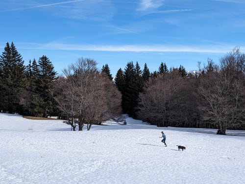 Thibault et Joane viennent en repérage à Grenoble, incroyable !! On se prévoit une petite rando pour montrer la neige à Weka. C'est un peu la disette sur la neige en ce moment, mais on en trouve quand même aux barres de la Molière. On mange au refuge un délicieuse quiche avant de rentrer, petite sortie grenobloise comme on les adore :) Hâte que vous soyez de l'équipe !