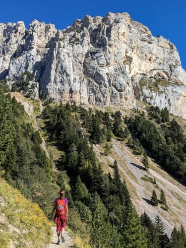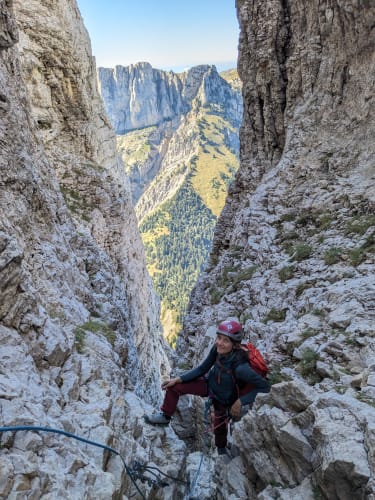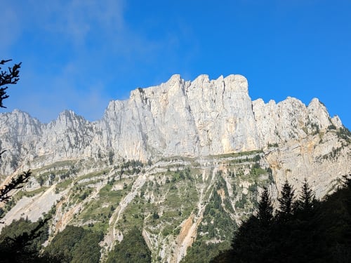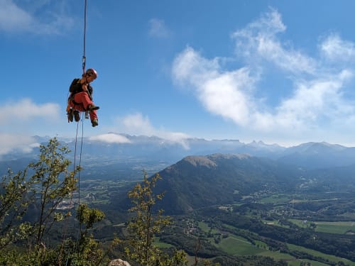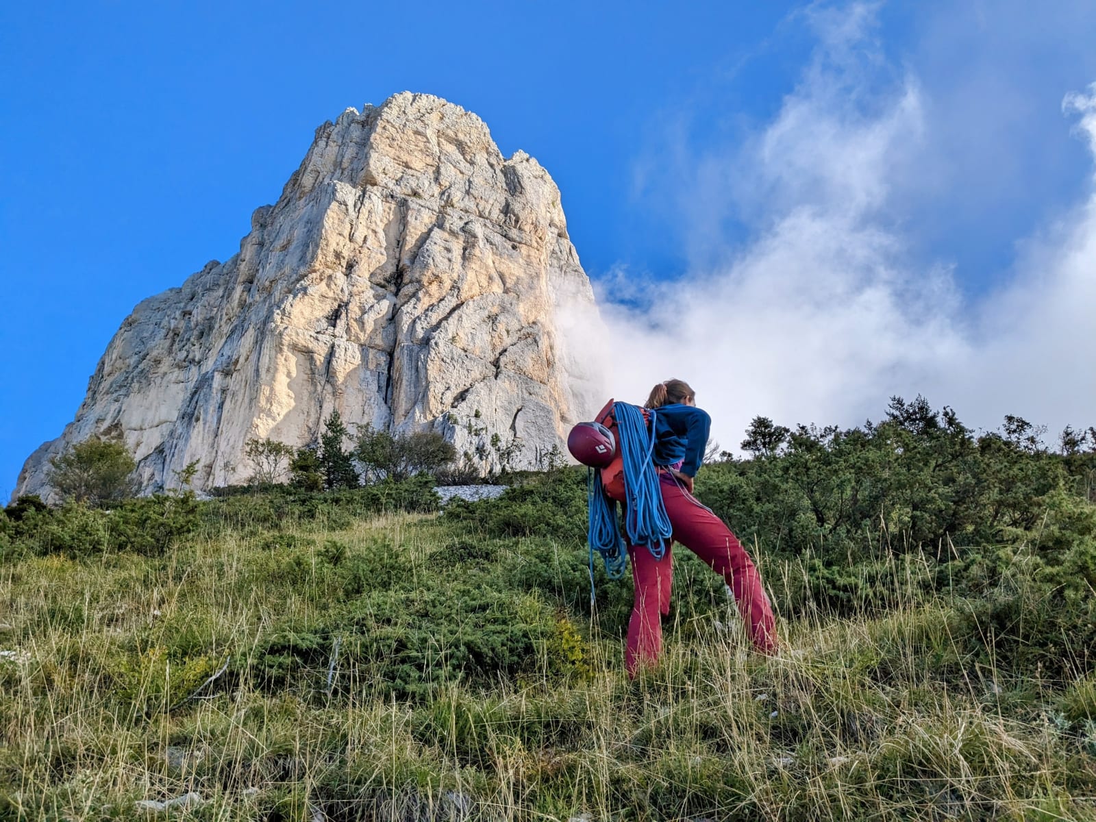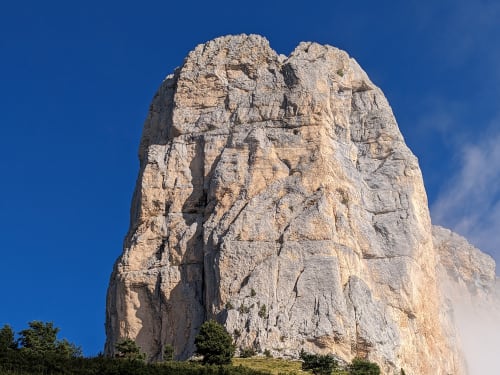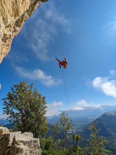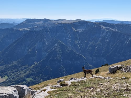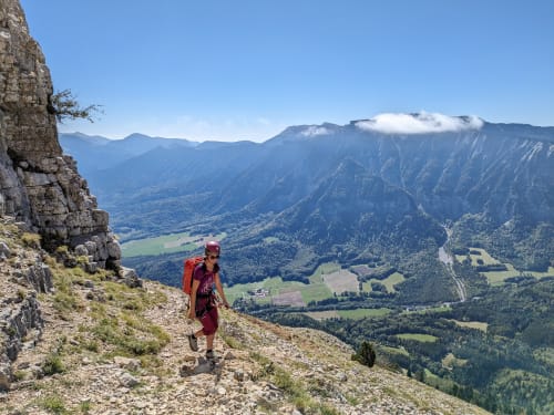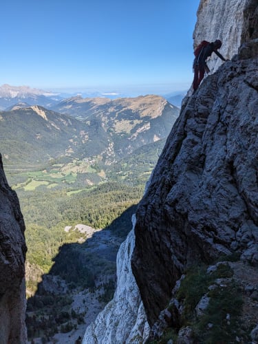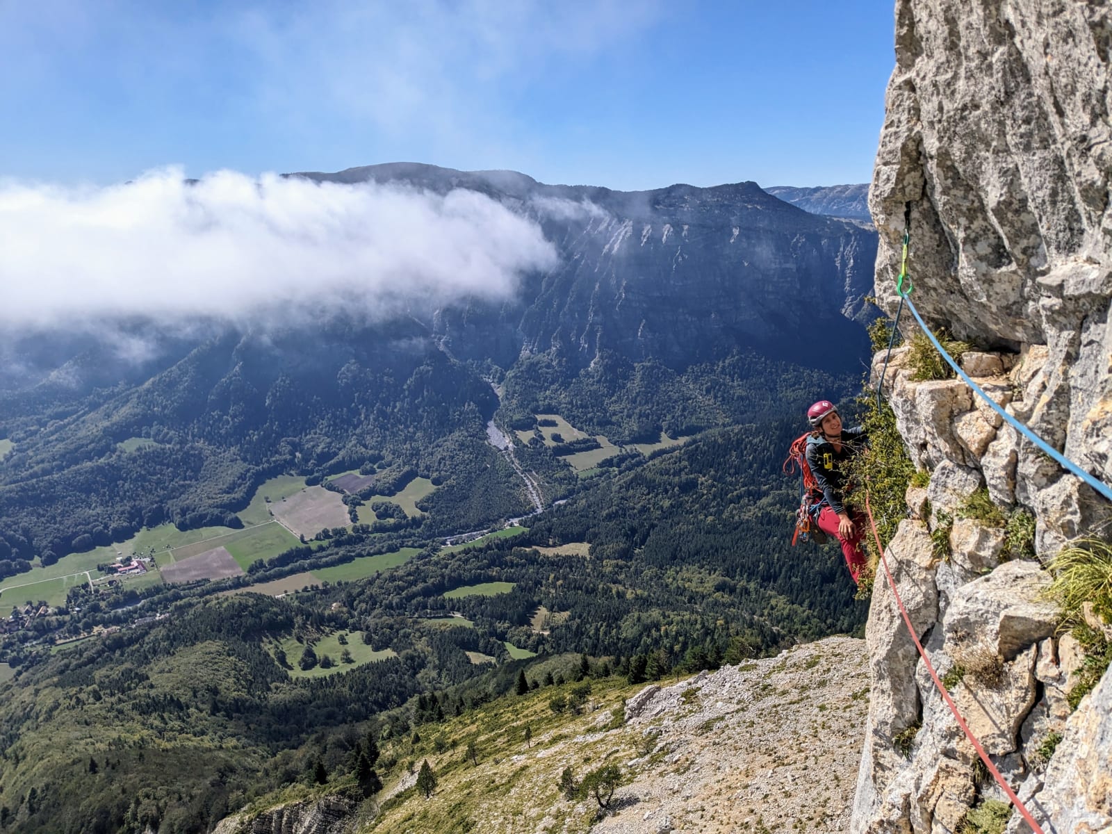 Ca fait 1000 ans qu'on en parle, alors cette fois c'est parti ! On part faire la voie des étudiants dans la fameuse face sud du mont Aiguille. Sauf que sans grande surprise, il y a déjà des gens dedans, et que le gros point noir de cette voie c'est le pierrier en entonnoir au sommet. Donc impossible de suivre une autre cordée. On tente de se rabattre sur la voie des diables, voisine un peu plus péchue mais bon on est des bonhommes. Bam la face sud Démarrage en trombe avec un emmêlage de corde à double dans les buissons de la première longueur, puis très belle décision de sauter le premier relais. Nico se retrouve dans la traversée plein gaz avec un équivalent pachyderme en tirage. C'est plein gaz, c'est physique, c'est sur coinceur. Ambre passe derrière, mais bon vu la panique initiale ça se passe plutôt pas si bien, avec en apothéose sur le dernier pas un friend qui bouge alors qu'elle tire complètement dessus. On décide sagement de faire un rappel (très joli rappel au demeurant !) 😱 A ce moment là, elle ne se doute pas que le friend vert va bouger 😱 Au moins ça fait des jolies photos ! Du coup au final on est tout en haut et on a encore masse de temps, donc on décide de partir faire la voie normale. Meilleure décision ever, on court dans l'itinéraire, c'est joli, on rigole, et on arrive bien heureux au sommet ! Pas mal de monde dans les rappels mais au final c'est facile de doubler vu qu'il y a plein de relais. Y a même des bouquetins au sommet !