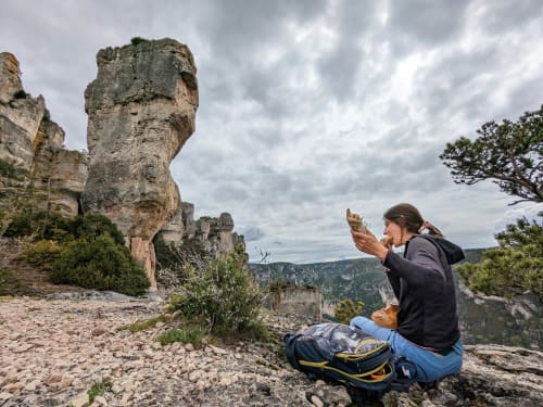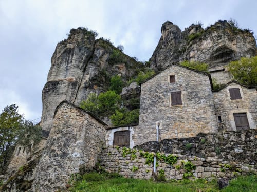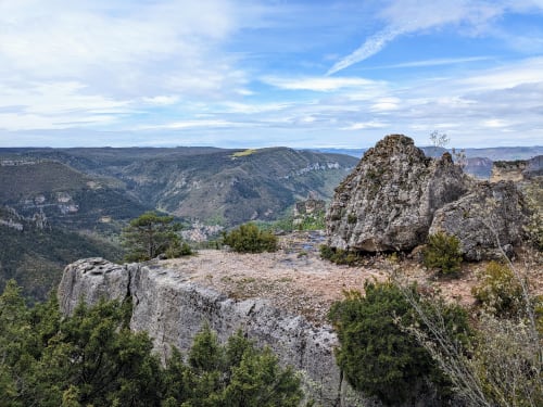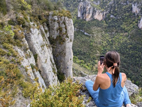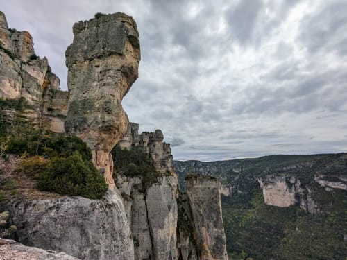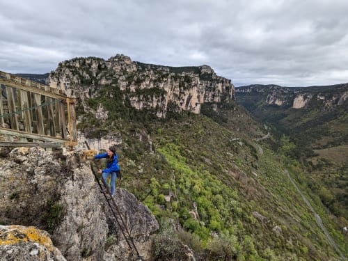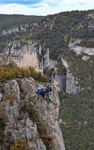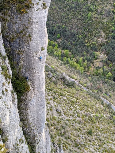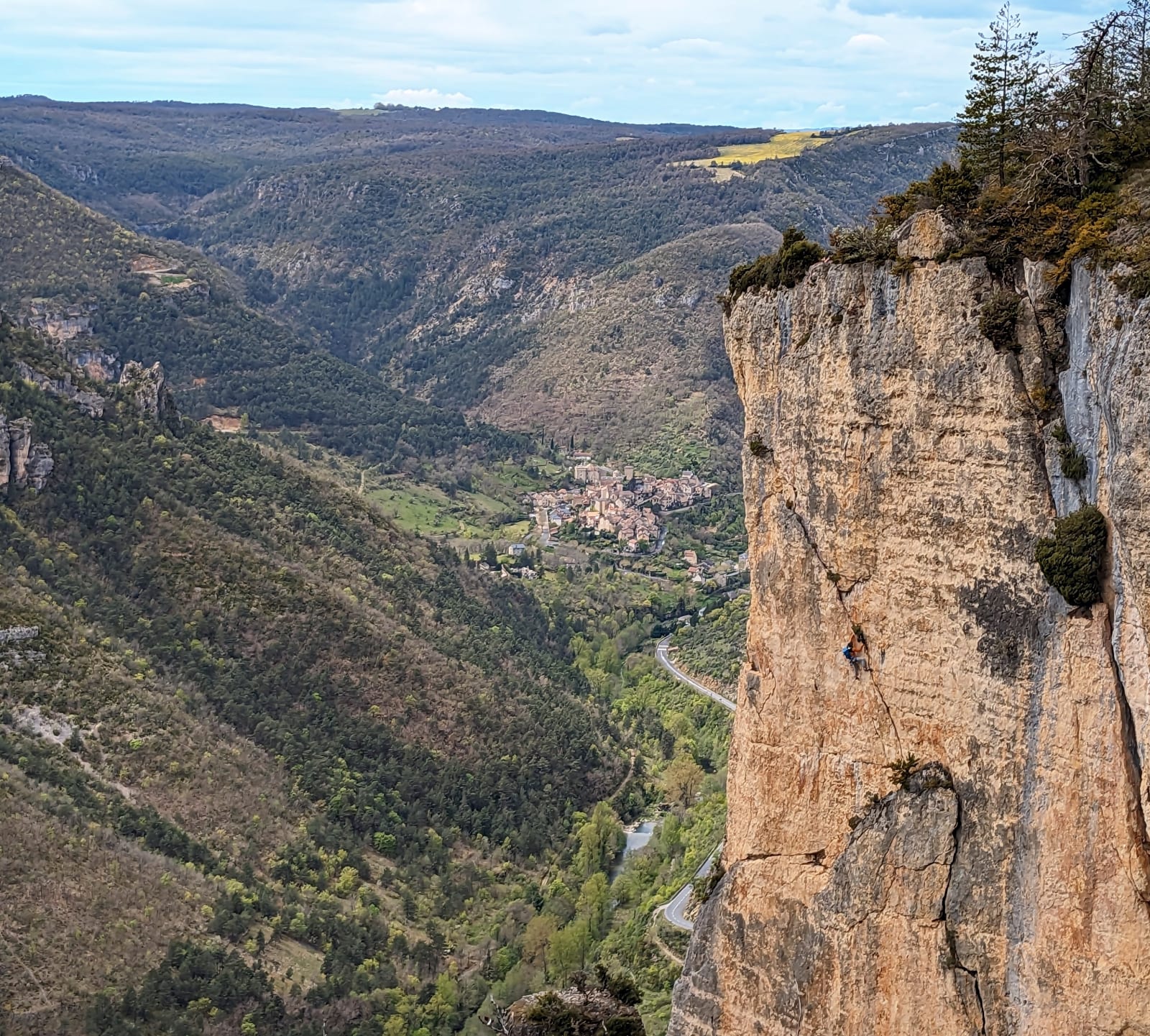 Ça fait un moment qu'on a acheté le topo du Tarn. C'était juste avant de se rendre compte que c'était le bout du monde. Mais bon, la team parisien s'est décidé pour une mission la bas, et ça match avec les vacances d'Ambre, donc la on se dit que c'est un signe du destin. Juste le temps de changer la batterie du van, de scotcher le rétro et de faire le plein et on est partis. On traverse l'Ardèche par la grande diagonale, juste le temps de voir une mamie promener sa chèvre de compagnie en ville et une maison recouverte de nains de jardin, et on arrive déjà aux gorges du Tarn. Et la of course, il se met a pleuvoir des seauuuuux d'eau. Ca nous empêche pas de faire un crochet par le point sublime et de croiser nos premiers vautours, plus nombreux que les humains en cette saison a priori. Le village du Rozier et ses jolis bâtiments au bord du Tarn On s'envoie dans une grande voie pas trop ambitieuse, il faut tenir la semaine entière quand même !! On prend donc celle a l'aplomb du vase de Sèvres, 6a max, petite 5c pour démarrer. C'est sans compter que Nico se plante instantanément de voie et s'envoie dans un 6b bien technique et bien a doigts direeeect. Ça chauffe. Il était temps qu'on arrive, il se fait faim ! Finalement c'est cool que ce soit pas long, on fait la petite rando des crêtes qui est fort belle et on en profite pour faire des photos des copains qui finissent leur voie. Wa c'est raidasse leur pilier ! Au final pas les plus incroyables grandes voies qu'on ait faites mais un cadre de ouf et beaucoup de vautours partout, c'est quand même assez classe 🔥