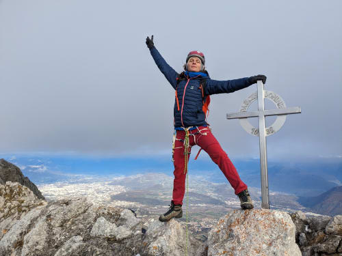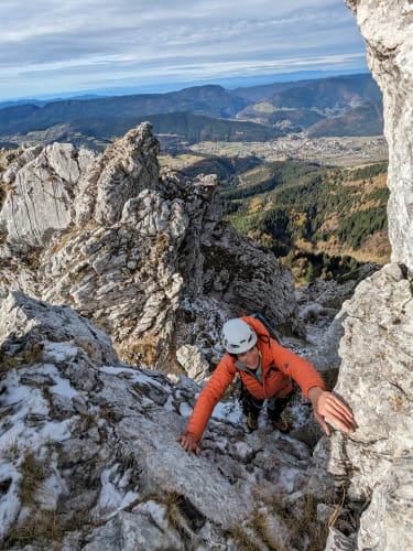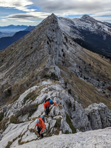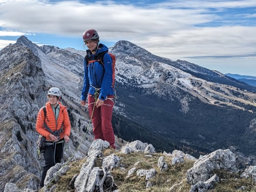 Petite sortie sans trop d'ambition au Roc Cornafion pour découvrir un nouveau coin ! On s'arrête à Prélenfrey, joli bled juste sous le mur du Gerbier. On se recueille rapidos sur la fissure en arc de cercle qui a emporté Lionel Terray, petit ange parti trop tôt. Montée au col vert tout à fait fraîche et agréable, puis on se balade sur l'arête avec 2 / 3 pas d'escalade. Très bel endroit et bonne marade avec les copains, tout ce qu'on aime.