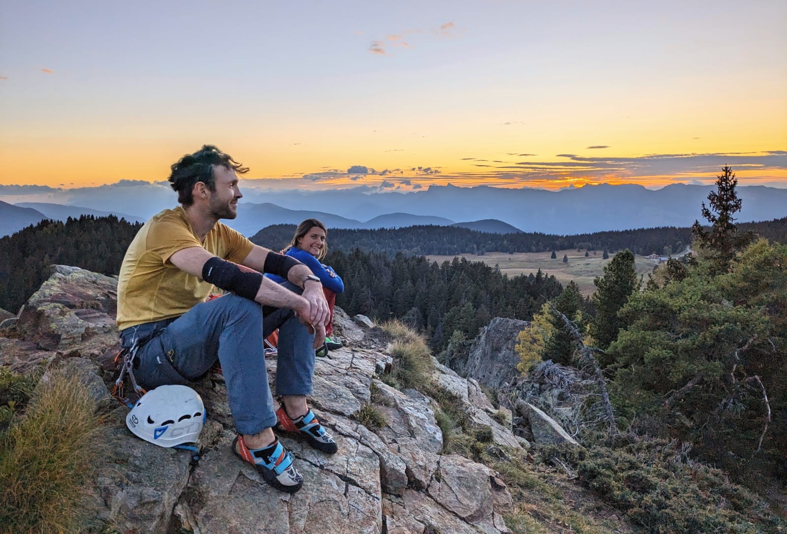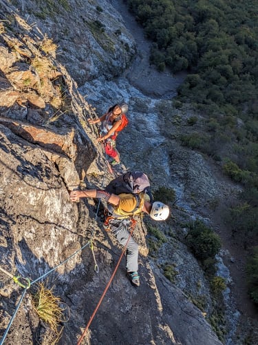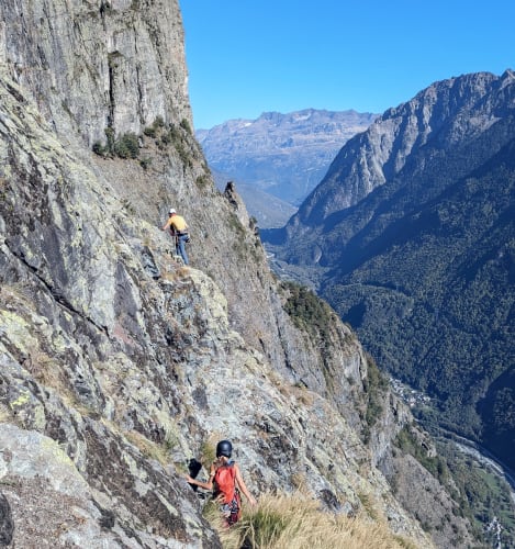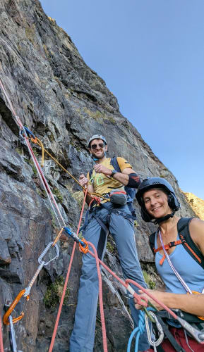 Petit weekend grimpe grenoblois, le beau temps est au rendez vous surtout le vendredi malheureusement ! Ivann se motive et arrive plus tôt qu'Emile, on part donc un peu tard au Rocher de l'homme faire une classique : No Raffaran. A peine arrivés à Chamrousse que BAM, on se rend compte que Ambre a oublié son casque... Finalement elle arrive à choper un casque de ski au seul bar du coin ouvert, ça lui fait une dégaine de bobsleighesuse On galère un poil à se repérer à la descente, mais au final on trouve le pied de la voie. Derrière ça déroule, on change de leader à chaque relais. Petite mention à Nicolas qui a loupé un relais mais qui a improvisé une manoucherie avec toute ce qu'il avait au baudrier pour relier 2 spits éloignés de 4m ^^ Jolie voie qui réconcilie avec le gneiss du rocher de l'homme !