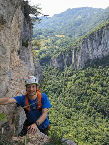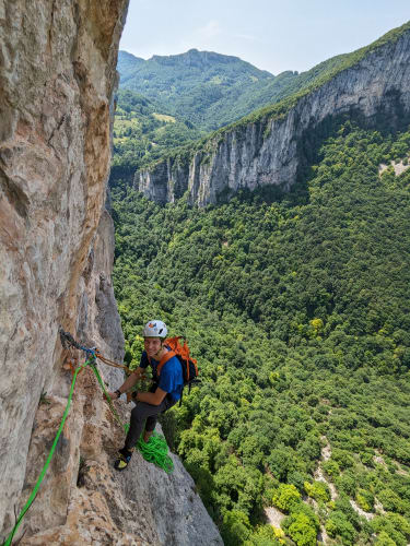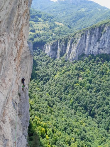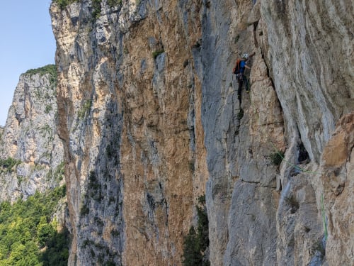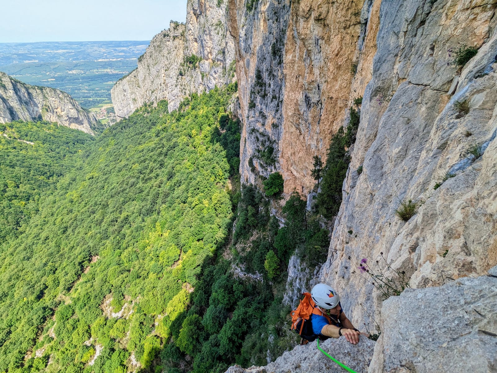 Ça y est je rejoins le club des gens désoeuvrés le vendredi ! Enfin quelqu'un pour m'accompagner faire quelque chose pendant tout ce temps libre ^^ On a repéré une voie pour aller poser des coinceurs avec Kevin, et dans un nouveau coin en plus ! En route pour les gorges du (cheese) nan, 35min de Grenoble sans prendre l'autoroute en plus. On galère un peu a trouver le parking, pas spécialement étonnant vu la tronche de l'approche. On se croirait plutôt parachuté au milieu de la jungle que sur une "bonne santé". On trouve quand même assez vite le départ, infesté de moustiques mais qui a l'air de bien se protéger en effet. C'est Kev qui ouvre le bal. Une prestation un peu bullish comme on dit, a base de 4m entre les friends dans des passages en 5. Ensuite petit passage dans du moins bon mais protegeable pour moi, et enchaîné avec la longueur en 5+. On commence a poser des câblés, toujours content en les posant mais globalement souvent ramassés sur la corde par Kevin. Vient ensuite la grosse longueur de traversée avec un petit pas bien sympa sans les mains ^^ Bien joué a Kev pour l'itinéraire pas toujours simple a protéger mais qui déroule très bien. Au final on termine la voie en 2h40, et la sortie en moins de 4h. Pas mal pour une reprise !
