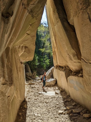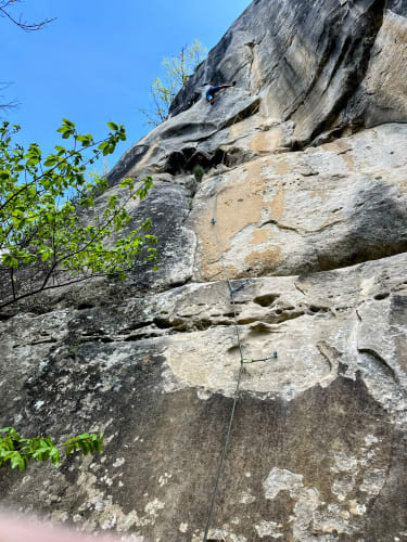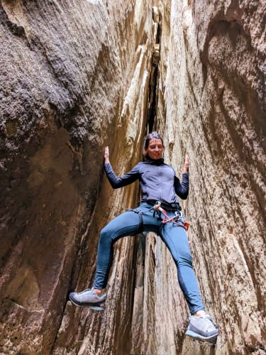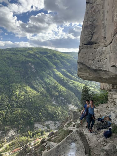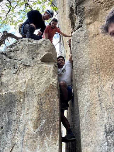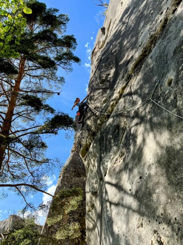 On retrouve les copains qui ont organisé un stage de 5 jours avec Hugo, notre guide d'alpinde de cet été. Le but pour eux : apprendre a grimper sur coinceurs et progresser dans les mouvs de fissures. Du coup on se greffe pour enfiler des gants de crack pour la première fois !! On était déjà venu y a quelque temps, mais on était nuls et on avait pas assez de matos. On refait la même voie que la dernière fois, et la c'est 100% randonnée. Comme quoi savoir bloquer ses pieds ça aide pas mal !! Du coup Hugo en profite pour nous faire travailler des mouvs de renfougne, c'est assez golri, mais c'est épuisant de ouf 😵 Wa enfin une main, j'ai les coudes en sang en fait lol Le lendemain, nous on se lance dans des couennes pour ne pas monopoliser toutes les voies de crack. Et ben c'est une super surprise !! On fait deux 6c MAJEURES, très sûrement les plus belles du voyage ! Ambre flash même carrément Conatus, un 6c clairement pas volé 💪😎 Regardez la virevolter sur ce superbe grès 🧚 Au bilan sûrement la partie du séjour qu'on a préféré avec beaucoup d'apprentissages et des voies épiques Ces fissures c'est quand même assez dingue !