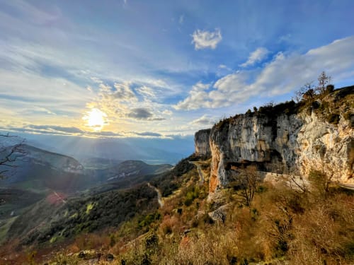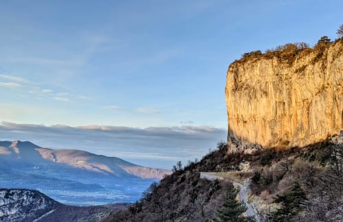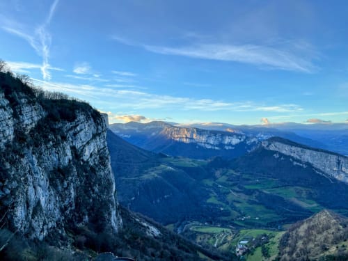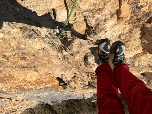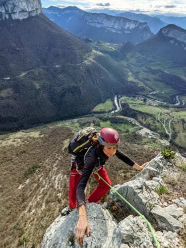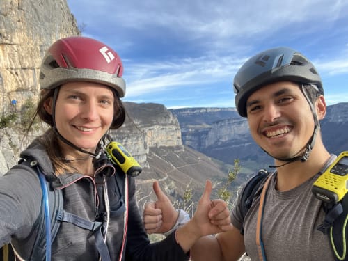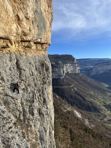 C'est officiellement l'été en ce mois de janvier 2023, notre conscience écologique en prend un coup mais en attendant faut bien s'occuper les weekends. Du coup go Presles ! Nico qui se la coulait douce à Paris depuis 2 jours n'a rien vu venir mais en fait la grippe a bien réussi à Ambre. Elle sélectionne la voie la plus dure qu'on ait jamais faite : la mémoire des absents à Presles. 230m de voie, 8 longueurs soutenues : 6b/6b/6a/6c(A0)/6b/6a+/6a/6b On a un peu peur du vent (45km/h en rafale) mais au final on ne se fera bien secouer que sur la dernière longueur. Le jour se lève au Paradis Des la première longueur en 6b la couleur est donnée : Nico est pas en forme, c'est dur de se trimballer après toutes ces fêtes 🥵 Heureusement, Ambre passe en mode machine, pas une goutte de sueur, pas un moment de stress 💪😎 Du coup c'est parti c'est Ambre qui va tout ouvrir ! Contente d’en avoir finie avec la 6c 😸 Nico qui se fait hisser à la microtrax On partage cette belle paroi avec deux autres cordées sur des voies parallèles, avec qui on fera toute la journée de grimpe sur le même rythme - départ 9h30, tout le monde sort en haut à 15h30 ! C’est assez pratique pour se donner des informations (« seeeeec ! »). En bas des chasseurs quadrillent le périmètre, on a peur qu’ils nous prennent pour du gibier volant 🐗 Les cordées voisines qui essaient d’échapper aux tirs de chasseurs Pas mécontent d'arriver en haut ! Au final une voie magnifique, bien prisue et bien physique, bien équipée dans les parties « dures » et plutôt aérée dans le 6a/+ - mieux vaut être à l’aise dans ce niveau pour se faire plaisir. Bête de journée et bête de performance pour Ambre. Avis aux challengers, va falloir bosser sec pour tenir la cadence de 2023 !! Joli coucher de soleil pour finir