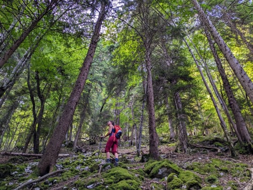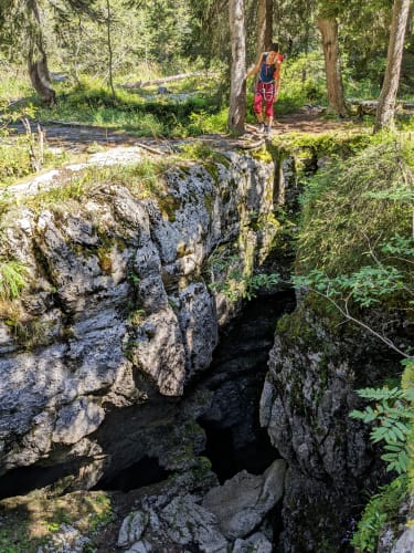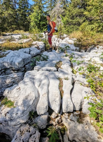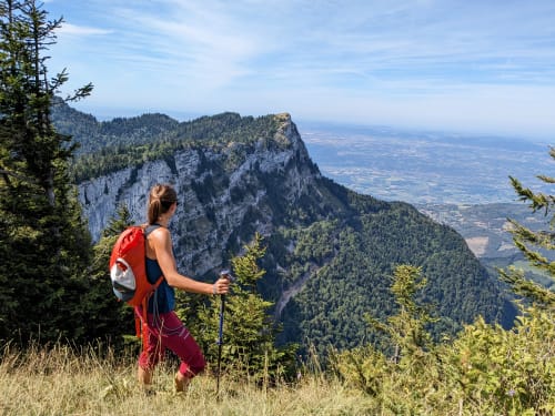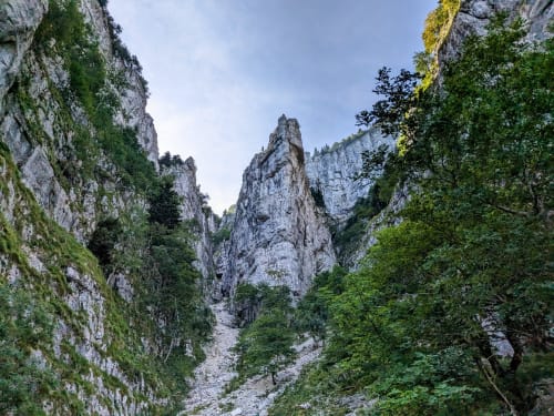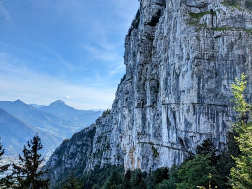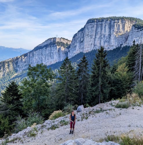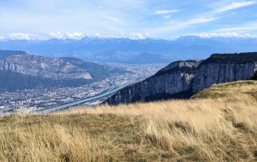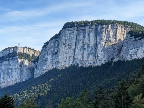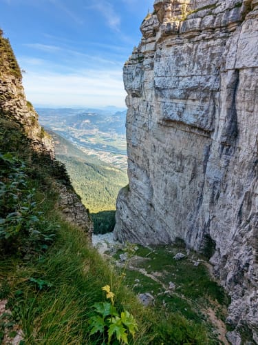 Dernière croix de l'été, et en récupération du mariage des Bismuth c'était pas une partie de plaisir. Clairement l'une des rando les plus teigneuse qu'on ait faite de l'été et en petite forme et avec la chaleur c'était pas donné... Mais qu'est-ce que c'était beau ! Départ dans une forêt dense et un peu glauque, on arrive dans des pentes douces de pins assez espacés, c'est joli et ça grimpe bien (ça doit être sympa à skier d'ailleurs). Coup d'oeil dans l'impressionante draye de Séblou qu'on laissera pour longer la falaise jusqu'à la draye des communaux. Les mouches commencent à nous tourner autour, elles nous lâcheront pas jusqu'à la sortie de la draye (relouuuuuu). C'est beau mais y a vraiment 0 sentier, c'est casse patte, c'est long et les mouches c'est agaçant my god. On arrive dans la draye mais on a qu'une envie c'est d'en sortir pour plus se faire martyriser de bourdonnements. On attaque le pierrier pour monter, c'est très très raide et instable. Des petites réminiscences du couloir des 3 Pucelles dans les genoux qu'il faut monter trèèèès haut. Quand même joli comme "chemin" Sur le plateau ENFIN les mouches nous larguent. On est claqués mais on veut avancer avant de manger. Heureusement c'est la plateau, donc bien plus facile. On se chauffe même à faire le crochet pour aller voir les lapiaz de l'entrée du gouffre Berger. Ici RDC -> en dessous étage -1000 On rejoint le haut des télésièges de la station d'Autrans. Dommage c'est si plat et feuillu qu'on a pas de beau point de vue sur ce côté du plateau... On fait une micro sieste dans l'herbe avant de repartir pour le sommet de la Sure et la descente. Encore une fois, un goût de bout du monde avec cette prairie du plateau qui tombe sur une falaise de 300m. Si proche de Grenoble c'est dingue A la descente, on se chauffe pour faire le pas du Mortier et s'éviter le tunnel en entier. On fait bien, c'est la meilleure partie de la balade, c'est marrant à descendre et on a une super vue. Déjà de l'autre côté ! La fin de la descente est longue mais le cirque de la Sure est vraiment badass, ça fait plaisir d'avoir enfin une vue un peu dégagée sur ces falaises de ouf. Les deux drayes au loin, enfin une vue bien dégagée !